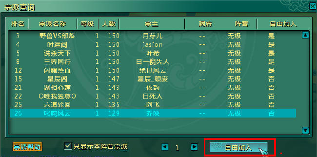 找到宗派使者,与其对话,打开“查找宗派”,在该面板上可查看到各宗派基本信息,玩家可选择那些允许自由加入的宗