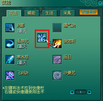 按“I“快速打开功能栏,鼠标左键点中已经学习到的技能,拖动放置到界面的技能快捷栏中,选中使用对象后,即可右键点击图标,或者按其对应的键盘快捷键使用该技能。