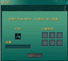 第二步:将需要拆解的武器装备左键拖动至化元炉界面中的“兵甲”格中,此时化元炉界面右边的六个格子将预鉴可能得到的材料。 第三步:左键点击“化元”按钮,这样便完成装备拆解,得到的材料自动放入包裹,被拆解的武器装备自动消失。